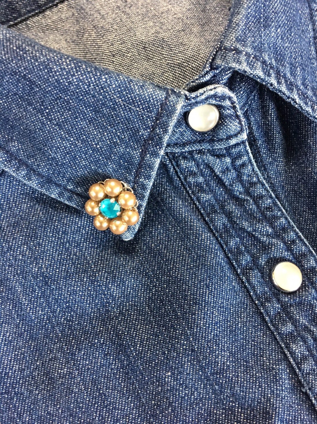 私は、カジュアルなデニムのシャツにピンブローチを付けてみました。