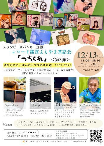 クリスマスソングから始まって「地元のロック&フォーク」(国内・海外編)そして「ユーミンとクルマと八王子」まで、シュートーレンと一緒にビンテージオーディオによる高品位サウンドをお楽しみください。