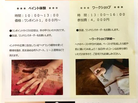 メヘンディ体験&ワークショップ (インド、中近東などに伝わるヘナを使ったボディアート)