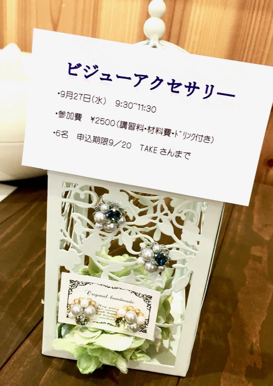 さて、cafeTAKEのビジューアクセサリー作りは、プロの先生による楽しい教室です。